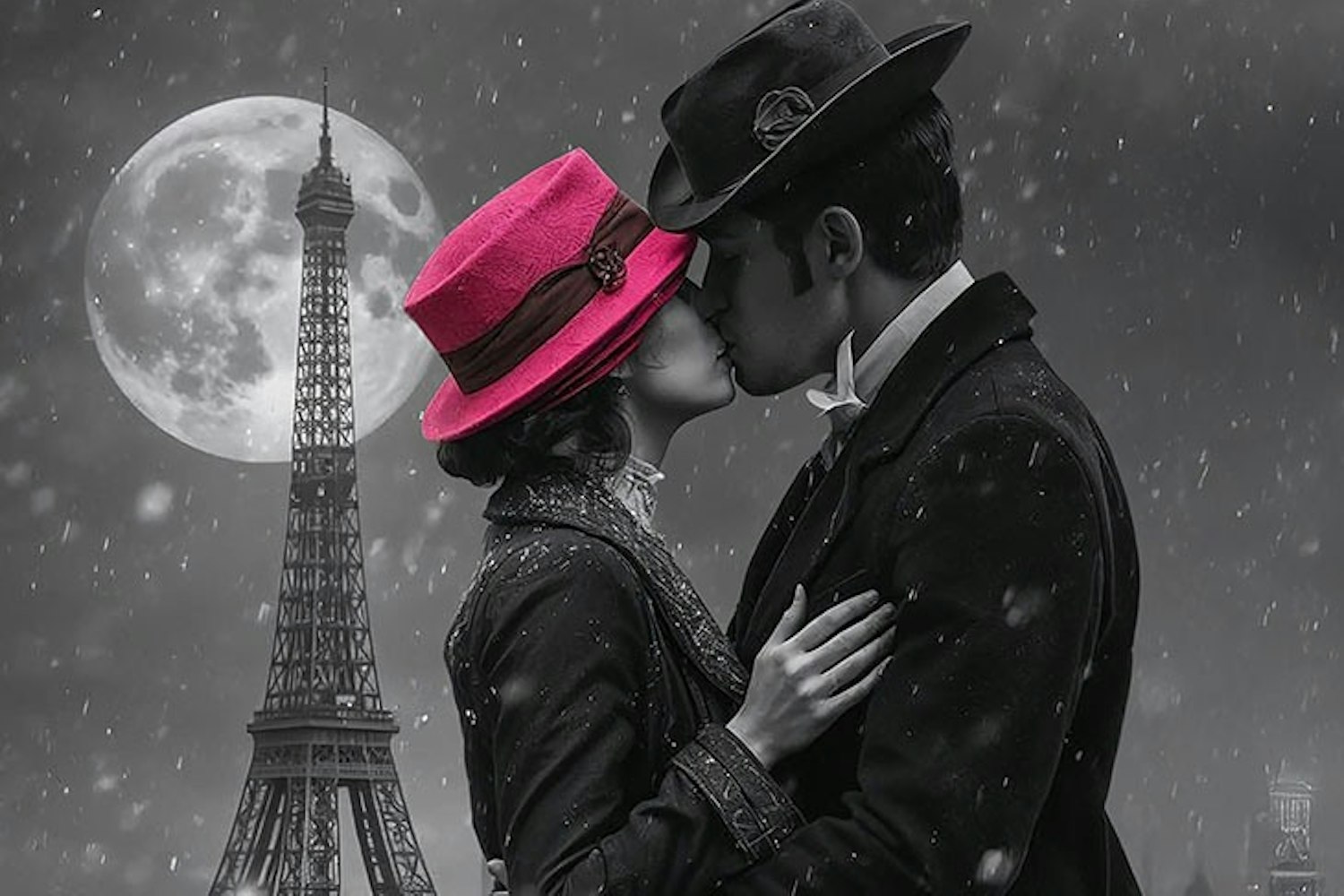 Het toneel ademt de sfeer van oude filmbeelden, alsof de wereld zelf nog gevangen zit in schaduw en stilte.